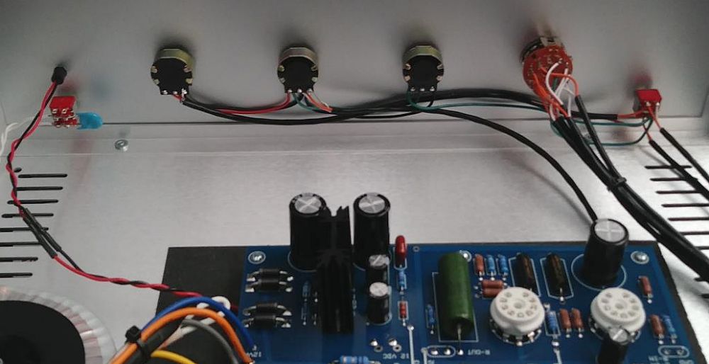 Vacuum Tube Audio SP12 - 2019 buildthese photos document a recent 2019 build of an SP12 preamp stuffed PCB bottom of PCB RCA jacks on rear panel ground buss wire added ![]() AC input wiring & power switch wiring front panel wired except selector switch selector switch wired closeup of master volume wiring finished front panel wiring finished rear panel wiring overview of interior